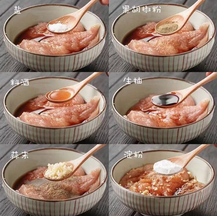 对于健身、减肥的小伙伴来说 鸡胸肉绝对算是不折不扣的“必备佳品” 它在健身食谱中有着不可撼动的霸主地位 鸡胸肉蛋白质含量较高 且易被人体吸收入利用 有增强体力,强壮身体的作用 同时它又是低热量低碳水 且饱腹感十分强的食物 可以有效地帮助大家控制食欲 虽说鸡胸肉是健身、减肥人士肉类的首选 但是普遍的水煮鸡胸肉 清新寡淡的味道,着实让人难以长久的坚持 今天多锐君就给大家推荐几个 简单、低卡又美味的鸡胸肉新做法 No.1 凉拌鸡胸肉 用料: 鸡胸肉 1块半(约400g) 泡姜 1块 葱花 2根 芝麻盐 10克 食用油 3小勺 花椒油 半小勺 蒜末 2瓣 干辣椒段 2根 食盐 3克 蚝油 2小勺 生抽 1小勺 红萝卜丝 少量 料酒 3小勺 做法: 1. 鸡胸肉顺着纹理切成约5厘米的大块 2. 鸡块冷水下锅,水开撇沫加料酒,煮约15分钟,鸡块就熟了。 3. 将鸡块捞出浸冷水。 4. 待鸡块冷却,顺着鸡肉纹理撕成细条,越细越好,便于入味。顺便准备好红萝卜丝、葱花并将泡姜拍散切小粒。 5. 调汁: a) 冷锅加入3小茶勺食用油、半小茶勺花椒油、蒜末、干辣椒段; b) 开小火,待蒜末微微变金黄色关火; c) 继续往锅内加蚝油、生抽、食盐,搅拌均匀待用。 6. 将红萝卜丝、葱花、泡姜粒、芝麻盐、步骤5调好的汁一起加入鸡丝,拌匀即可食用。 (做法来自下厨房app) No.2嫩煎鸡胸肉 用料: 鸡胸肉 一块 盐 半勺 黑胡椒粉 1勺 料酒 3勺 生抽 2勺 蒜末 2勺 淀粉 1勺 橄榄油 5g 清水 50ml 做法: 1. 一块鸡胸肉对半横切成平均的两片,再用刀背轻轻拍松让其更松软更容易入味。 2. 鸡胸肉中加入半勺盐、1勺黑胡椒粉、3勺料酒、2勺生抽、2勺蒜末、1勺淀粉(淀粉是为了让肉更嫩,如果你是严格控可不加)搅拌均匀,腌制30分钟使其充分吸收。 3. 鸡胸肉弹嫩的关键:锅中倒入5g橄榄油中火烧热20秒,下腌好的鸡胸肉,两面各煎15秒左右使表面略微变色。 4. 接着倒入50ml清水,盖上盖子小火焖个2分钟左右至水分收干,转中火,两面各煎个20秒,至其表面呈金黄色。用水汽焖熟鸡胸肉,肉质更嫩,鸡胸肉充分吸收水分而更加多汁。 5.嫩煎鸡胸肉完成! (做法来自下厨房app) No.3 孜然鸡胸肉小零食 用料: 鸡胸肉 1块 辣椒粉 1勺 盐 小半勺 孜然粒 1勺 蚝油 1勺 生抽 1勺 料酒 1勺 熟芝麻 1勺 做法: 1. 鸡胸肉切小块加入蚝油生抽料酒盐和大蒜抓匀腌制20分钟 2. 平底锅放一丢丢玉米油,把腌好的鸡胸肉放进锅里小火慢煎至表面焦黄,鸡胸肉很容易熟的,熄火加入孜然辣椒面熟芝麻拌匀即可 3.完工! (做法来自下厨房app) No.4鸡胸肉沙拉 用料: 鸡蛋 2个 圣女果 8-10个 生菜 5-6片 葡萄干 一小把 鸡胸肉 150克左右 盐 适量 料酒 一勺 黑胡椒粉 适量勺 酱油 勺 沙拉酱 适量 做法: 1. 鸡胸肉洗干净切成1公分厚片,加适量盐、料酒黑胡椒按摩均匀,放冰箱冷藏腌制20分钟 2. 锅烧热,加入油,放入鸡胸肉煎3-4分钟至一边边缘发白翻面继续煎3-4分钟。煎时可盖上锅盖。 3. 煎至两面带一些焦黄即可。 4. 生菜洗净稍微甩干水分,撕小块,西红柿切小块。鸡蛋煮熟切块。煎好的鸡胸肉切成条。摆摆好。 5. 撒上几颗葡萄干,加点盐和胡椒粉,沙拉酱或油醋汁就好啦~ (做法来自下厨房app) No.5减脂鸡胸肉鲜蔬饼 用料: 鸡胸肉 500克 西兰花 100克 玉米粒 100克 胡萝卜 100克 生抽 2勺 盐 小半勺 胡椒粉 适量 生粉 2勺 做法: 1. 鸡胸肉剁成肉泥,玉米粒煮熟,西兰花和胡萝卜切碎,虾生熟都可以 2. 全部材料调味料放到一起 3. 抓均匀 5. 热锅下点油,然后拿个勺子(涂点油防粘),然后用勺子把鸡肉馅料放锅里 6. 中小火两面煎金黄即可 7. 出锅! (做法来自下厨房app) 看了这么多料理鸡胸肉的新方法 你更偏爱哪种呢 答应多锐君 别再天天吃“水煮鸡胸肉”了 偶尔试试这些新花样 让减脂增肌的日子不再单调乏味吧