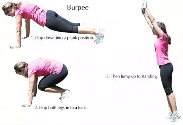 俯卧撑-收腿-站立起跳。这个动作可以调动全身肌肉,HIIT训练常用动作。